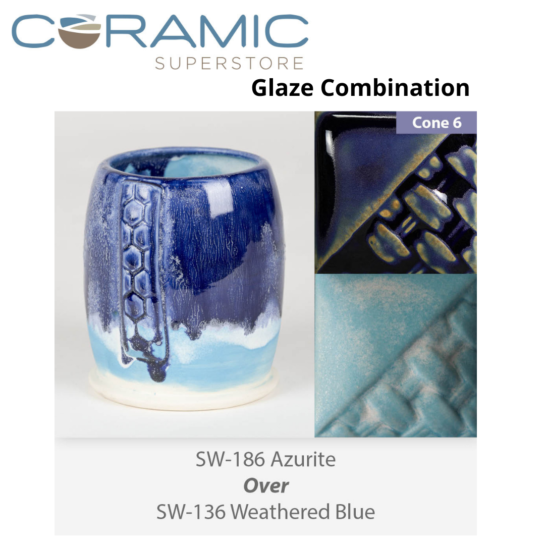 SW-186 Azurite over SW-136 Weathered Blue Stoneware Combination This technique was achieved by brushing on two (2) layers of base glaze (SW-136 Weathered Blue). Then apply two (2) layers of top glaze, letting glazes dry between coats This Combo Kit includes 1 – 16 ounce jar of each color shown above – 2 Jars Total…