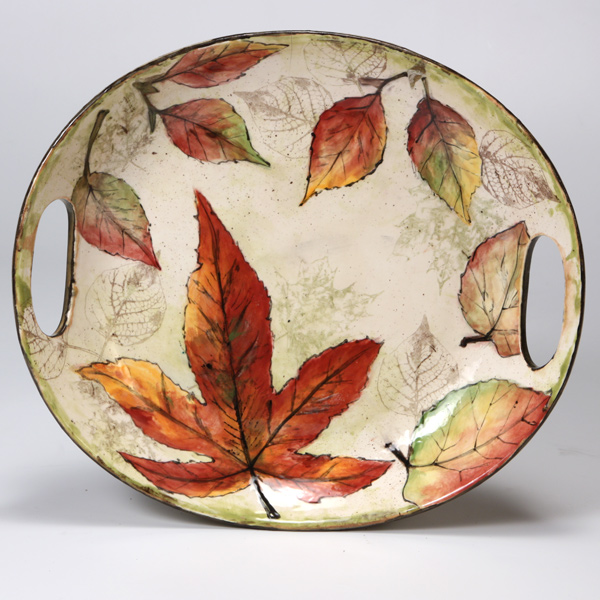 4. Thicken SC-34 Down To Earth and SC-39 Army Surplus with AC-310 Silkscreen Medium, using a palette knife, to the consistency of peanut butter. Use a couple of leaves from DSS-0113 Leaves to screen onto the platter as shown. Rub the thickened glaze over the screen with the shiny side down. Gently clean the screen with water.
