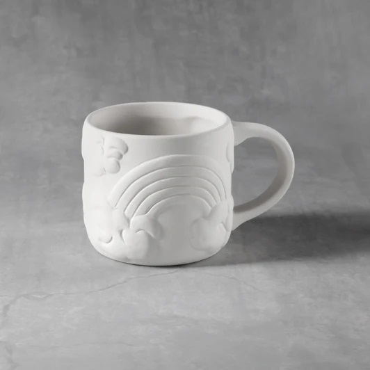 CCX985A Rainbow Mug in Ready to Paint, Cone 04 Ceramic Bisque All of our Ceramic bisque is fired to a cone 04 and is ready to paint. 4.5 H x 3 Dia Case of 6 This item is unpainted.You are purchasing an unfinished, Ready to Paint, Piece of Ceramic Pottery
