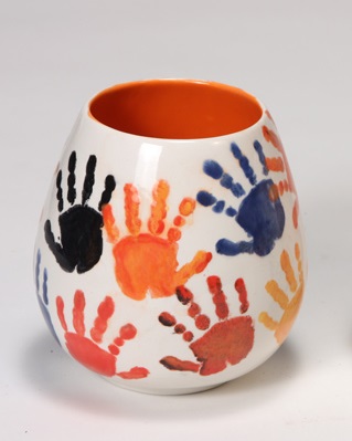 3. Use the colors noted above with the sponge-on-a-stick and Handprints Stamp. Dab color onto one handprint at a time with the color and, stamp to the tumbler in a random pattern.