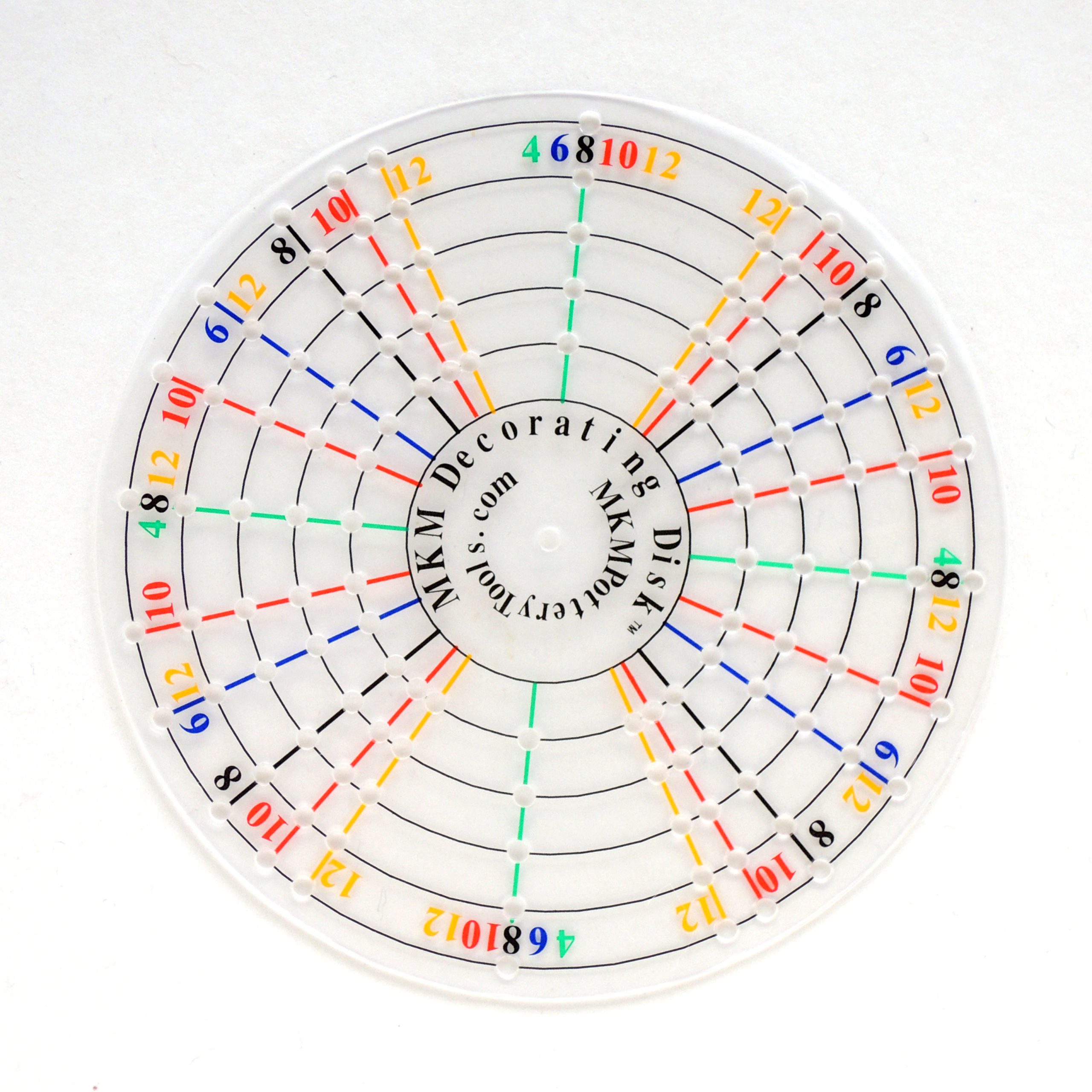 They are designed to allow the user to easily and quickly divide space, such as making a 5-sided plate out of a round thrown plate, putting four evenly spaced handles near the top of a large jar, or making sure a round bowl is squared accurately. Use the concentric circles to quickly center your piece. Colored radial lines indicate even divisions (2, 4, 6, 8, 10, 12) on one decorating disk and odd divisions (3, 5, 7, 9) on the other disk. The secret is the many holes!  The holes at the intersections of all the radial lines and all the concentric circles allow you to mark directly through the decorating disk to the surface below.
