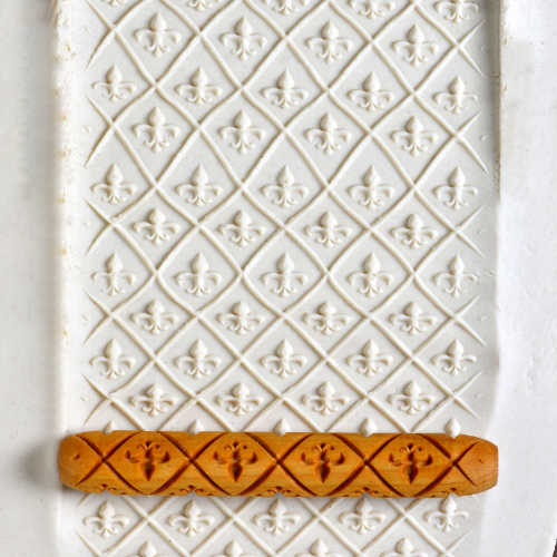 HR-025 – Fleur-De-Lis Hand Roller HR – HandRollers are deeply carved, have unique designs, and release well from clay and any soft medium. Our rollers are made from wood that is precision carved to make deep beautiful impressions. The rollers are also beveled carved, allowing them to release easily from clay. You simply roll the HR roller…