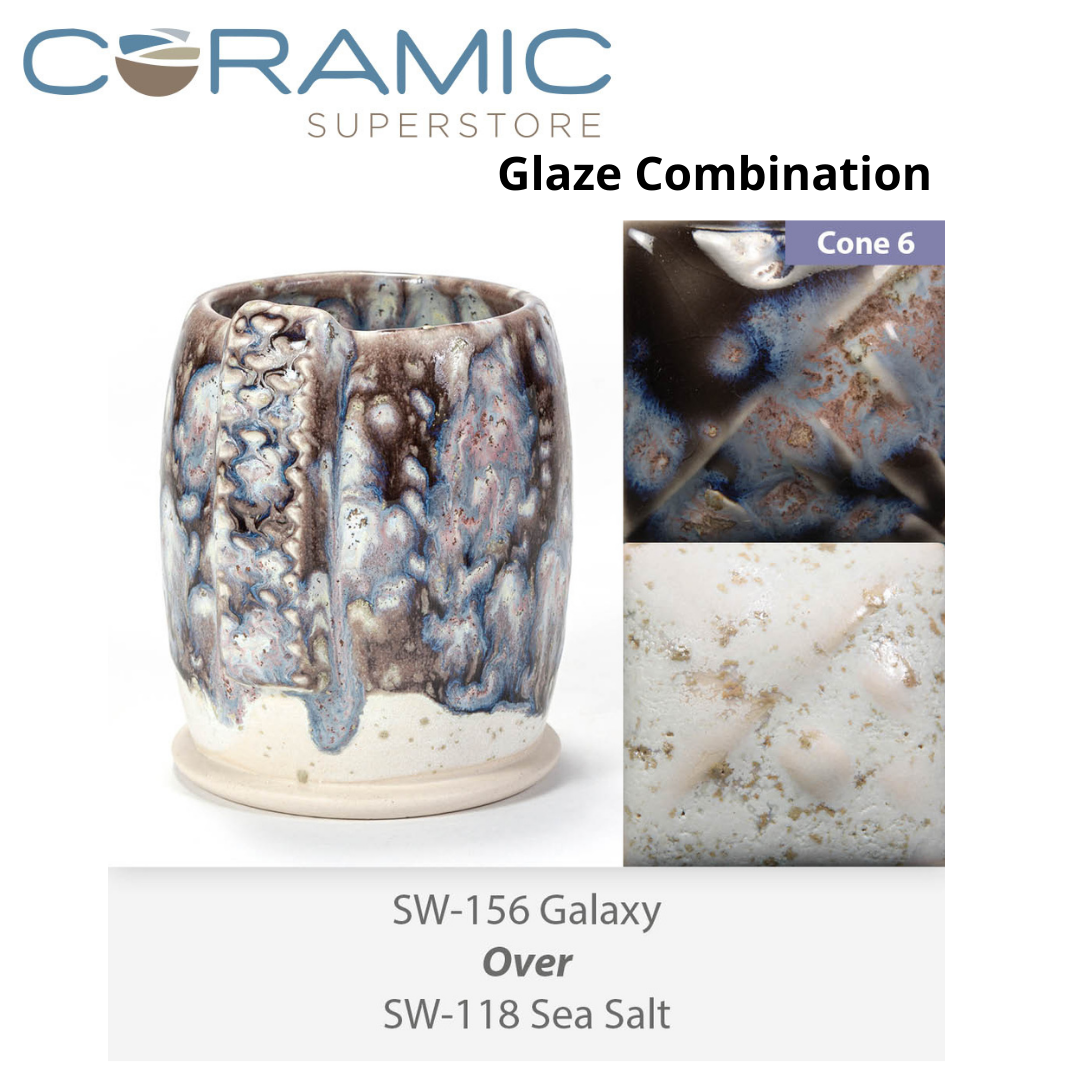 SW-156 Galaxy over SW-118 Sea Salt Stoneware Combination This technique was achieved by brushing on two (2) layers of base glaze (SW-118 Sea Salt). Then apply two (2) layers of top glaze, letting glazes dry between coats This Combo Kit includes 1 – 16 ounce jar of each color shown above – 2 Jars Total…