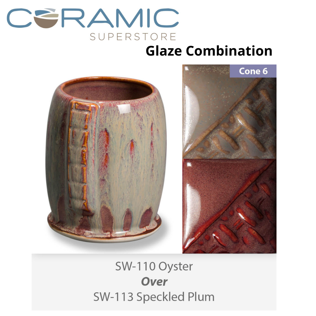 SW-110 Oyster over SW-113 Speckled Plum Stoneware Combination This technique was achieved by brushing on two (2) layers of base glaze (SW-113 Speckled Plum). Then apply two (2) layers of top glaze, letting glazes dry between coats This Combo Kit includes 1 – 16 ounce jar of each color shown above – 2 Jars Total…