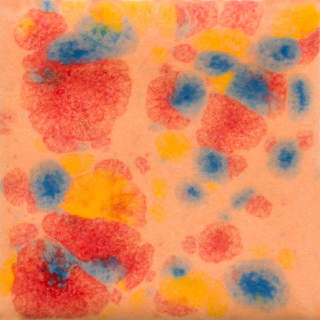 Party is an opaque peach base glaze with large red, blue, and yellow