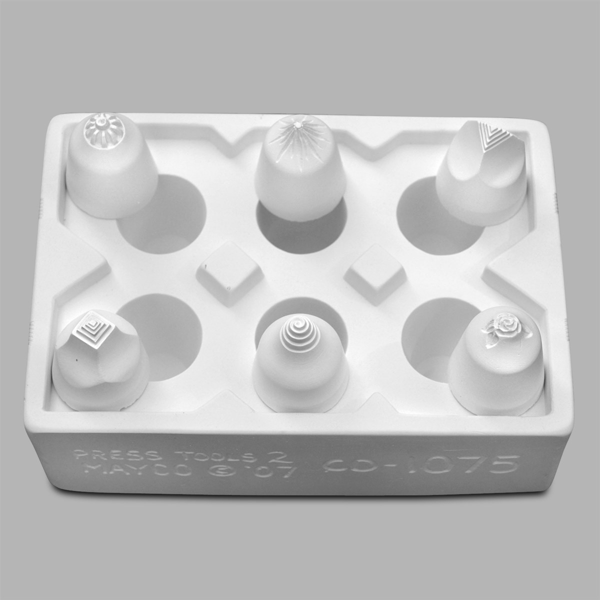 CD-1075 Press Tools 2 6 Small Designs 1.75 L x 0.625 Dia Press Tools add unique patterns and designs to clay surfaces. Create interest in your work by pressing directly into the main project, surface or by creating separate attachments. Smaller designs are great for stamping clay beads to use in creating jewelry.
