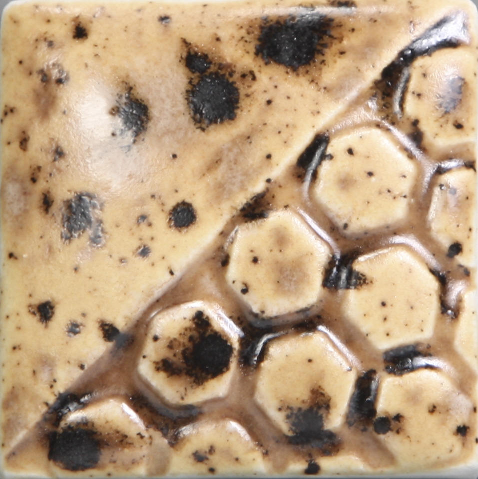 Cone 06: Spotted Walnut is a matte, mottled tan and light brown glaze. It has medium black and white crystals with black specks.