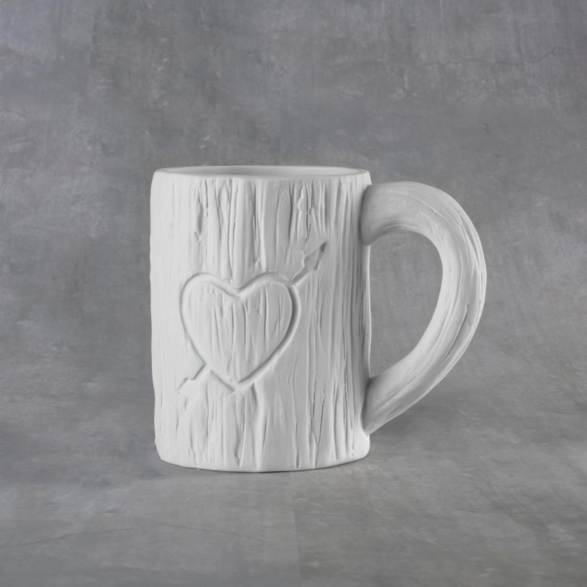 38111 Tree Carved Heart Mug 12 oz. in Ceramic Cone 04 Bisque By Duncan All of our bisque is fired to a cone 04 and is ready to paint. 5.25 x 3.25 x 4.25 Case of 6 This item is unpainted. You are purchasing an unfinished, Ready to Paint, Piece of Ceramic Pottery